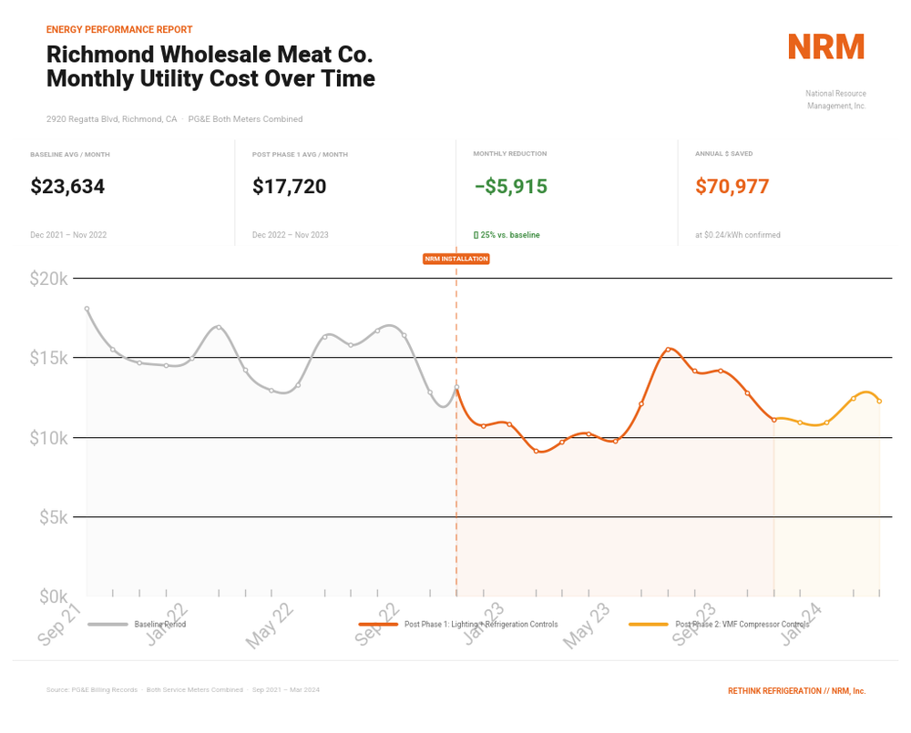 Combined, the two-phase project represents a $220,811 total investment projected to deliver over $100,000 in annual utility savings at $0.24/kWh — a simple payback of approximately 2.2 years. When accounting for Phase 1 alone on a confirmed basis, the project has already validated 295,739 kWh in annual savings, exceeding every pre-project estimate. NRM’s approach of layering refrigeration controls, lighting upgrades, and compressor optimization has produced a comprehensive energy efficiency solution tailored to the demands of a commercial refrigeration-intensive operation.